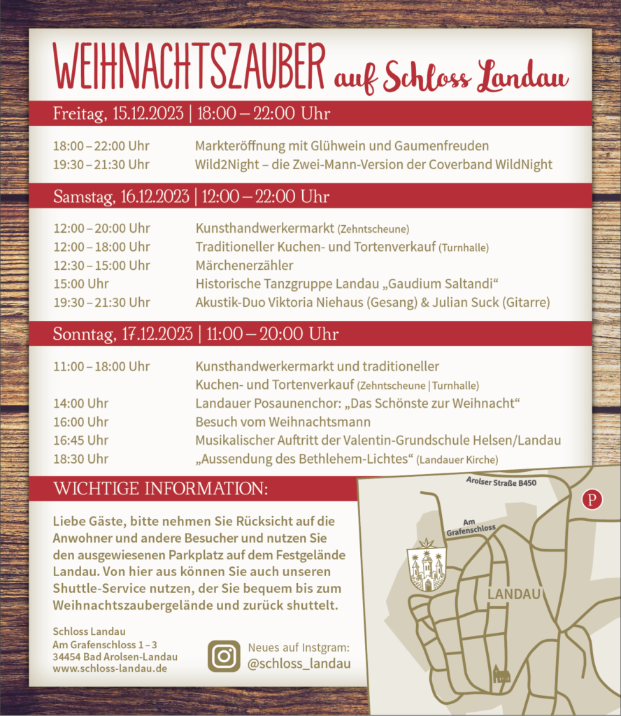Seit 2017 findet der Weihnachtszauber auf dem Areal um Schloss Landau statt und wird in enger Zusammenarbeit mit den Landauer Vereinen organisiert. Seither ist es unser Ziel, den Landauer Weihnachtszauber jedes Jahr vielfältiger und beeindruckender zu gestalten. Auch in diesem Jahr werden wir unser weihnachtliches Angebot erweitern und die Veranstaltungsfläche vergrößern. Lassen Sie sich von köstlichen Weihnachtsmarkt-Klassikern verführen, genießen Sie unsere Live-Musik-Auftritte am Abend in geselliger Stimmung mit einem heißen Glühwein. Freuen Sie sich auch dieses Jahr auf die Auftritte der Landauer Vereine und besuchen Sie unseren beliebten Kunsthandwerkermarkt in der Zehntscheune. Das detaillierte Programm werden wir Ihnen hier zeitnah mitteilen.